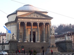 The tympanum of the church states: ORDO POPVLVSQVE TAVRINVS OB ADVENTVM REGIS, which can be translated as: The Nobility and the Population of Turin for the Return of the King. Which king, hmm?